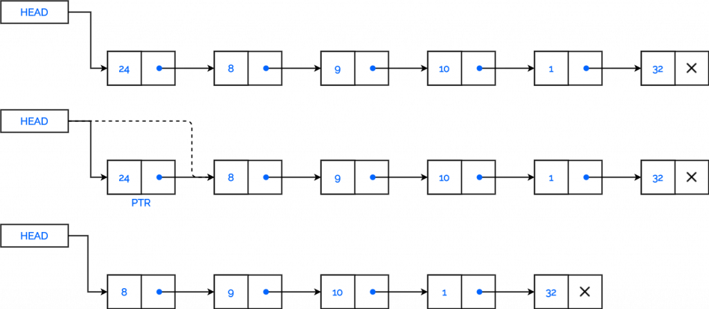 - We first initialize PTR with the address of HEAD. Now the PTR points to the first node of the linked list.