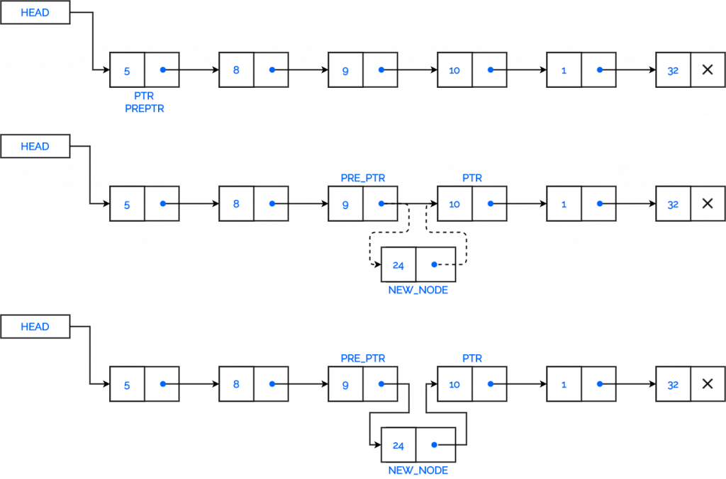 The last case is when we want to add a new node after a given node. Suppose we want to add a new node with value 24 after the node having data 9. These changes will be done in the linked list.
