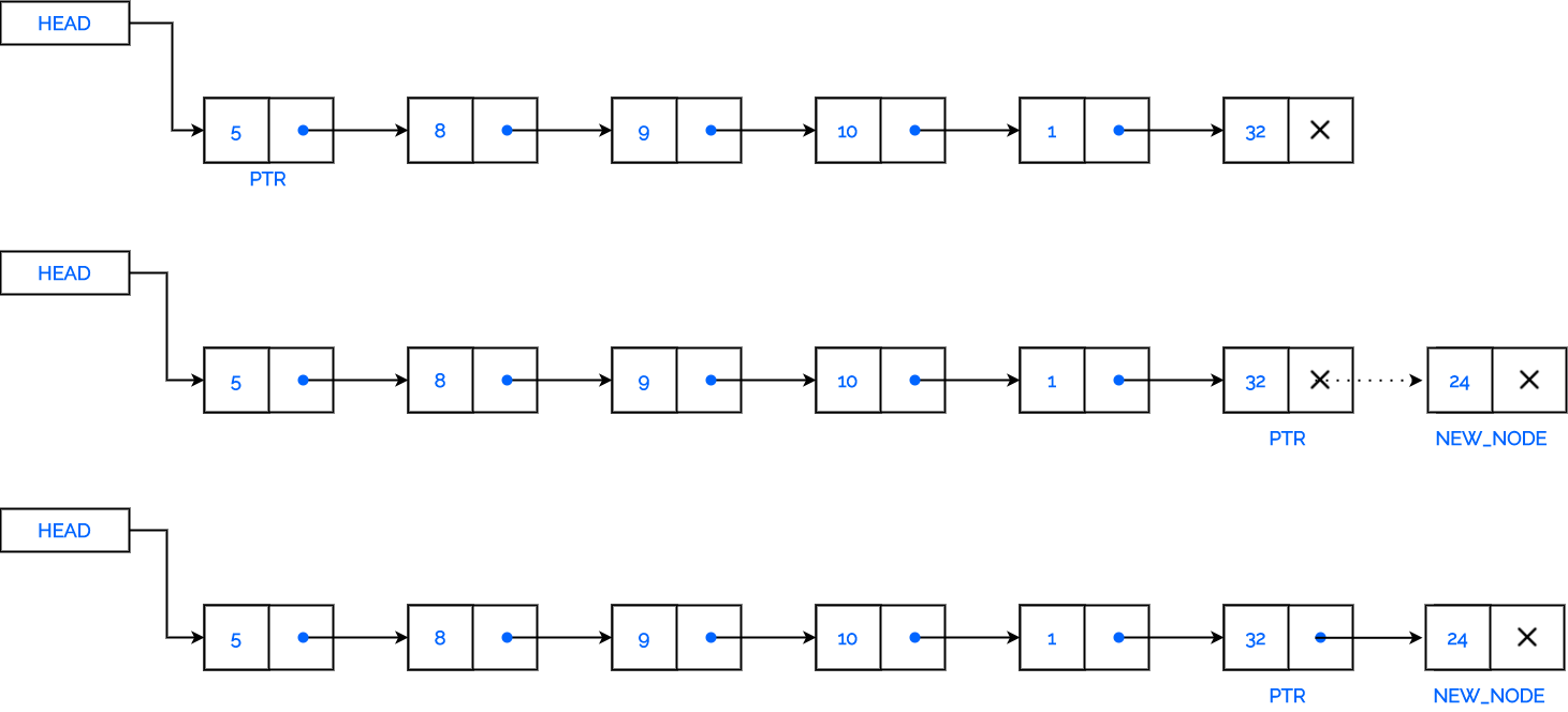 - Point the NEXT part of the last node to the newly created node.