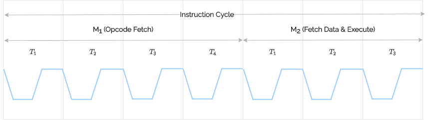 The fetch cycle takes 4 t-states and the execution cycle takes 3 t-states. A typical instruction cycle and the machine cycles within it is shown in the figure.