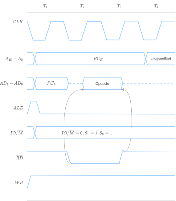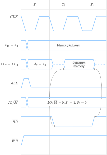 become 1 and 0, signifying a Memory Read Machine Cycle.- By the end of the first T state, ALE goes low. Lower address bits should be latched by this time.