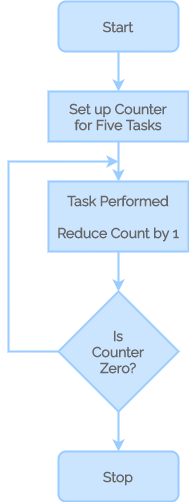 The following flowchart illustrates the approach needed for the microprocessor to repeat a task five times.