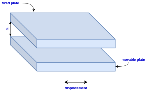 As shown in the figure, one plate is kept fixed and the other movable. When the plate is moved, the area of overlapping of plates changes, and the capacitance also changes. The capacitance value and area are directly proportional to each other. These types of transducers are used to measure relatively large displacements.