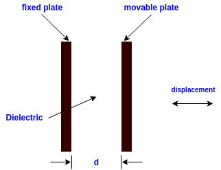 The capacitance can be varied by changing the distance between two plates. From the equation for C, we can observe that C and d are inversely proportional to each other. That is, the capacitance value will decrease with increasing distance and vice-versa. This principle can be used in a transducer by making the left plate fixed and the right plate movable by the displacement that is to be measured as shown in the figure.