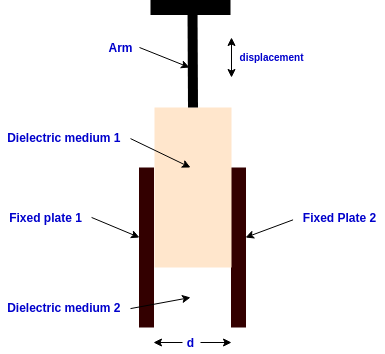 In this arrangement, a dielectric material is filled into the space between the two fixed plates. It can be moved using the arm. This causes a variation in dielectric constant in the region. The change in dielectric constant will vary the capacitance of the transducer.