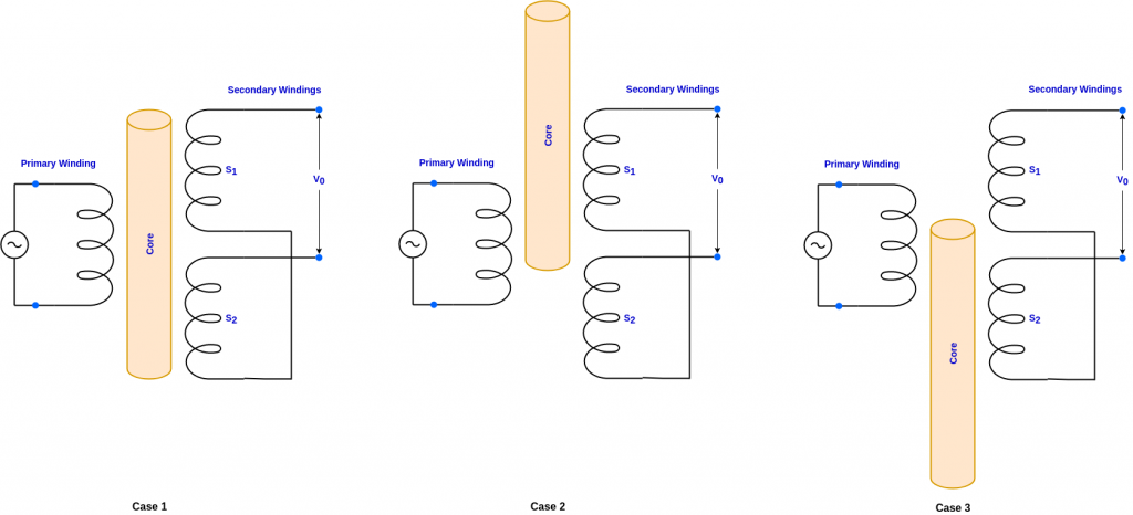 When the core is positioned at the centre (Case 1), voltages induced across winding S1 and S2 are equal(but in reverse-phase). Then, the resultant voltage V0=0. In this case, we say there is no displacement.